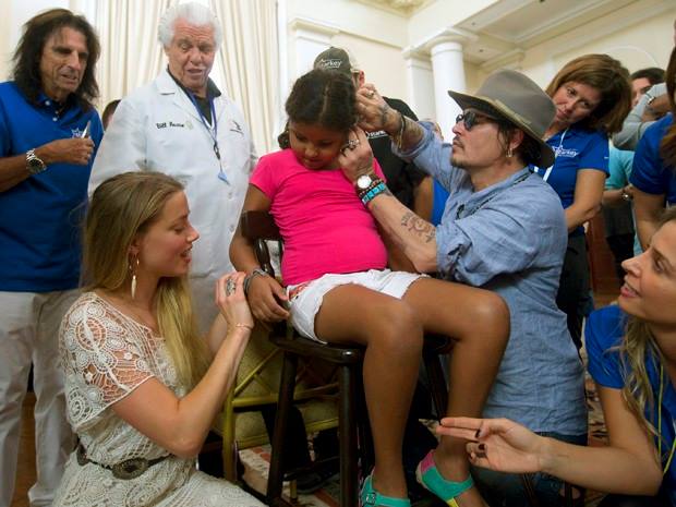 Junto a su esposa, la actriz de Amber Heard, puso un audífono en el oído de una niña durante un evento en una institución en Río de Janeiro.